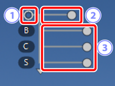 ). - De standaard aanpassingsschuifbalken zijn [B] (helderheid), [C] (contrast) en [S] (verzadiging).