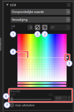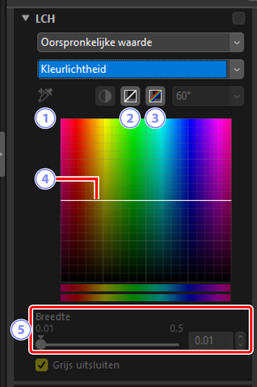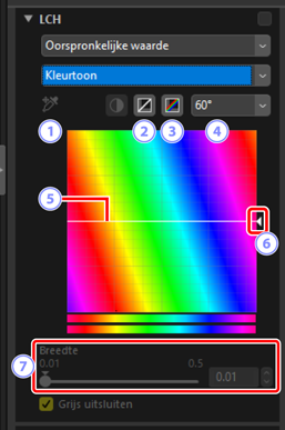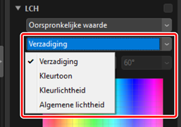 Pas lichtheid, verzadiging en kleurtoonkanalen aan. Kies een kanaal met behulp van het menu in de LCH-tool. De beschikbare opties verschillen per geselecteerd kanaal. De LCH-tool wordt niet weergegeven wanneer [Aanpassen met behulp van HDR] is ingeschakeld.