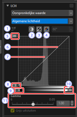 Pas de gehele lichtheid aan zonder verzadiging of kleurtoon te beïnvloeden. Instellingen kunnen worden aangepast met schuifbalken of door de lichtheidscurve rechtstreeks te wijzigen.