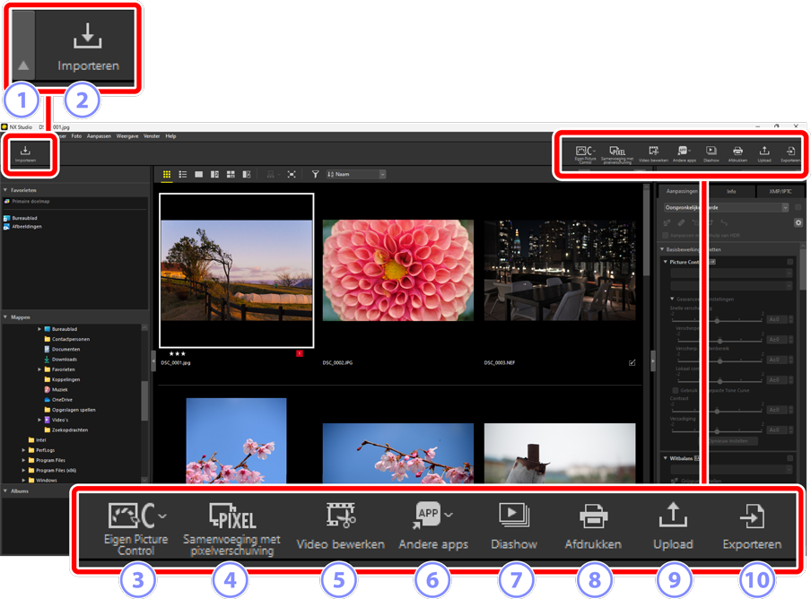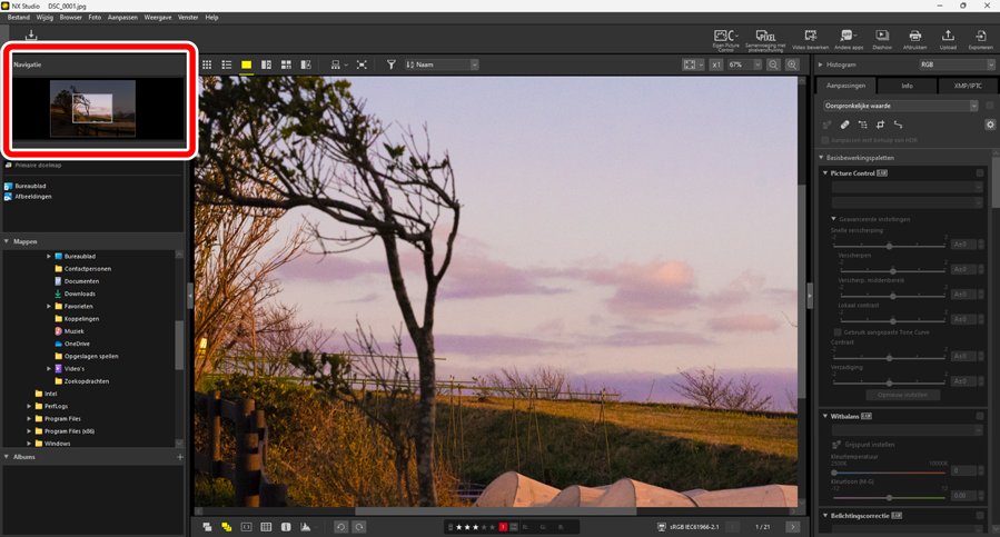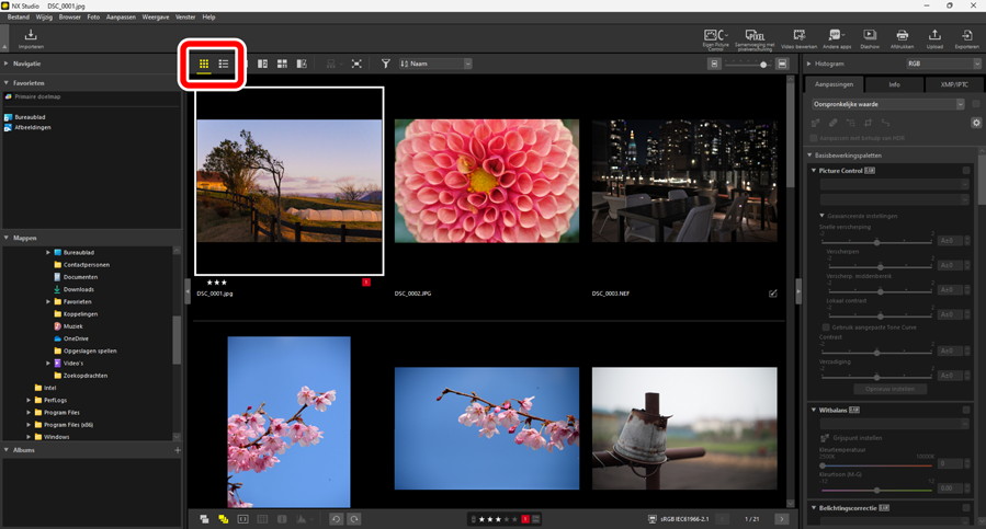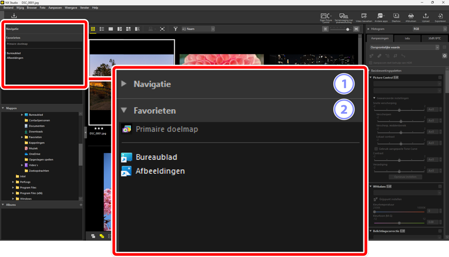 - [Open het originele beeldbestand zonder wijzigingen (geen aanpassingen aangebracht)]: De bestanden worden in hun oorspronkelijke formaten geopend. In NX Studio gemaakte verbeteringen worden niet toegepast.
