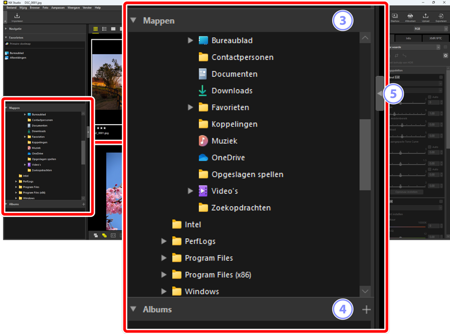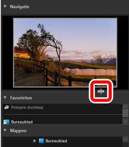 De subpaletten [Navigatie], [Favorieten], [Mappen] en [Albums] kunnen worden bekeken of verborgen door op de knoppen