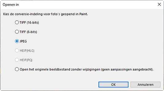 - [HEIF (HLG)]/[HEIF (PQ)]: alleen beschikbaar in het geval van foto's die zijn vastgelegd in HLG op camera's die toonmodusselectie ondersteunen.