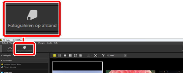 Indien geïnstalleerd kan NX Tether worden gestart door op [Fotograferen op afstand] te klikken in de werkbalk.