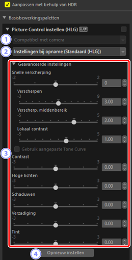 Door het inschakelen of uitschakelen van [Aanpassen met behulp van HDR] worden alle Picture Control-instellingen gereset.