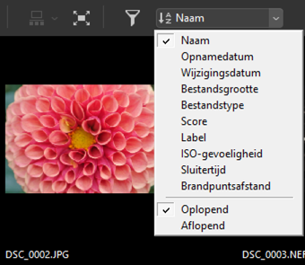 Sorteer miniaturen in het weergavegebied of de filmstrip.