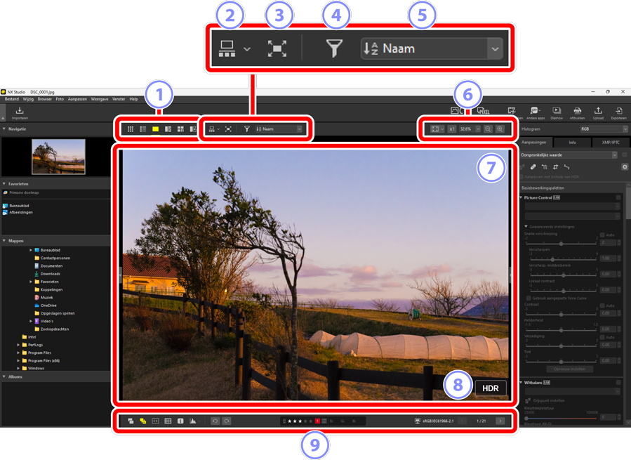 Foto's worden weergegeven in het weergavegebied. U hebt de keuze uit weergavemodi, waaronder niet alleen miniaturen en enkelbeeldweergave, maar ook vergelijkingsweergaven naast elkaar en voor-en-na-bewerking.