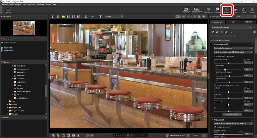 Als u de huidige selectie of de foto's in de huidige map in een diashow wilt weergeven, klikt u op [Diashow] in de knoppenbalk.