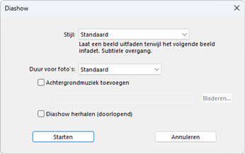 De opties in het dialoogvenster [Diashow] bepalen hoe lang foto's worden weergegeven, de overgangen tussen dia's en andere instellingen voor diashows. Klik na het aanpassen van de instellingen op [OK] om de show te starten.