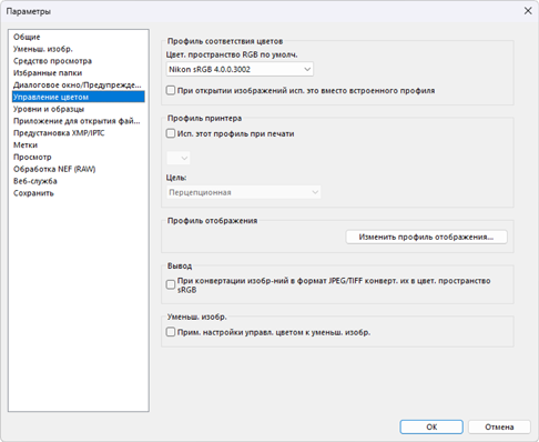 - Выберите [При конвертации изобр-ний в формат JPEG/TIFF конверт. их в цвет. пространство sRGB], чтобы встроить цветовой профиль sRGB в снимки, преобразованные в другие форматы во время экспорта. Исходный цветовой профиль перезаписывается.
