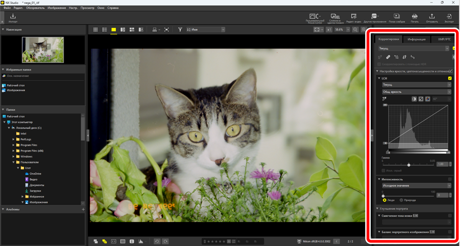 Оцифрованные пленочные негативы можно преобразовать в позитивы с помощью инструмента [Уровни и искажения] на вкладке [Корректировки].