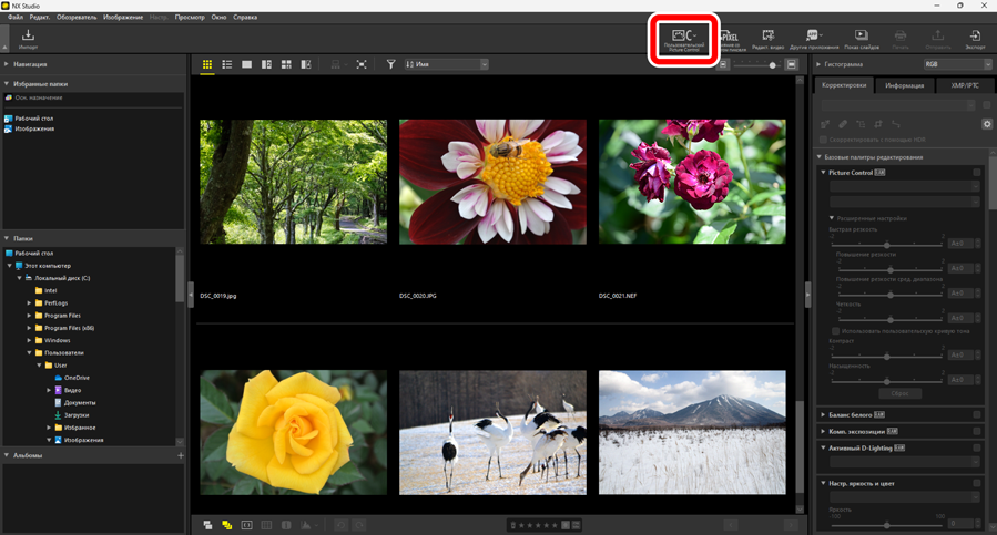 Файлы пользовательского Picture Control, созданные с помощью совместимых фотокамер и программного обеспечения, можно сохранить, импортировав их в NX Studio.