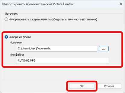 В диалоговом окне [Импортировать пользовательский Picture Control] выберите [Импорт из файла], выберите нужный файл и щелкните [ОК].