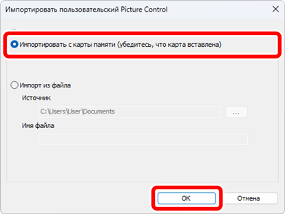 В диалоговом окне [Импортировать пользовательский Picture Control] выберите [Импортировать с карты памяти (убедитесь, что карта вставлена)] и щелкните [ОК].