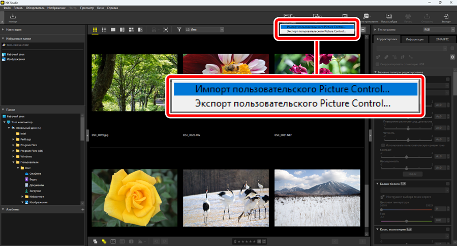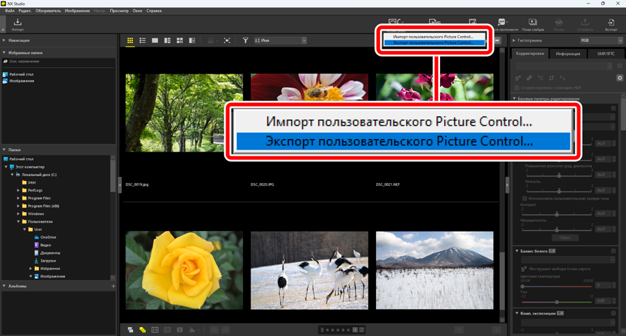 Пользовательские Picture Control, сохраненные в NX Studio, можно экспортировать в виде файлов.