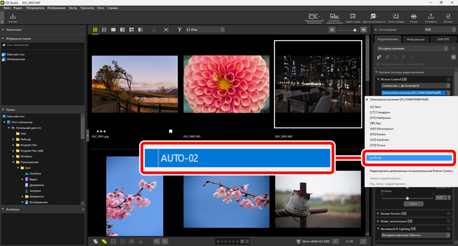 Импортированные пользовательские Picture Control, сохраненные в NX Studio, можно применить к изображениям, выбрав пользовательский Picture Control из выпадающего меню под [Picture Control] на панели «Корректировки» (0 Инструмент «Режимы Picture Control»).