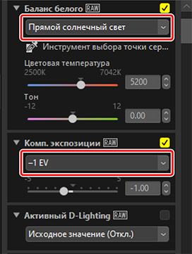 Измените настройки на панели «Корректировки». Здесь мы установили [Баланс белого] на [Прямой солнечный свет], а [Комп. экспозиции] на [−1 EV].