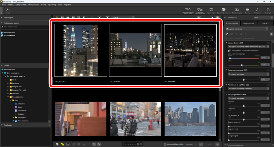 В NX Studio любой набор корректировок можно применить к нескольким снимкам. Настройки можно сохранять и применять к другим снимкам либо с помощью менеджера корректировок, либо с помощью меню «Корректировки» в каждом инструменте.