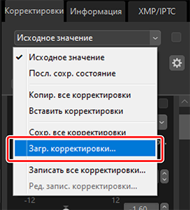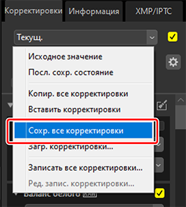 Используйте [Сохр. все корректировки] для сохранения всех корректировок в файле корректировок. Впоследствии этот файл можно загрузить и применить к выбранным снимкам с помощью [Загр. корректировки]. Файлы корректировок также можно копировать для использования на других компьютерах.