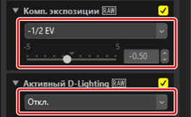 Корректировки применяются к выбранным снимкам. [Комп. экспозиции] изменяется на значение, выбранное в шаге 1, а [Активный D-Lighting] возвращается к [Исходное значение (Откл.)].