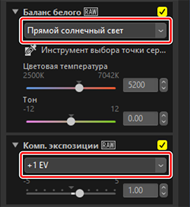 Измените настройки на панели «Корректировки». Здесь мы установили [Баланс белого] на [Прямой солнечный свет], а [Комп. экспозиции] на [+1 EV].