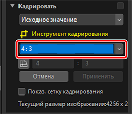 - Размеры текущего кадрирования. Чтобы ввести размеры непосредственно в текстовые поля, выберите [Настраив.] в раскрывающемся меню соотношения сторон.