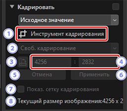 - Текущий размер снимка. Значение обновляется, отражая новый размер после кадрирования снимка.