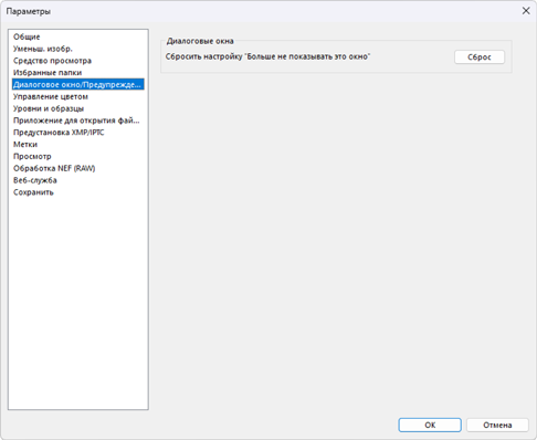 Выберите, будут ли сброшены флажки [Больше не показывать это окно] для всех диалоговых окон.