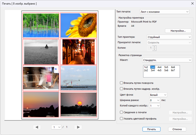 Чтобы напечатать несколько изображений на странице, выберите [Лист с эскизами] для [Тип печати]. Вы можете выбрать размер изображения и количество снимков, печатаемых на странице.