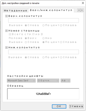 - [Верх. колонтитул]: введите текст и выберите выравнивание для верхнего колонтитула, который будет печататься вверху каждой страницы.