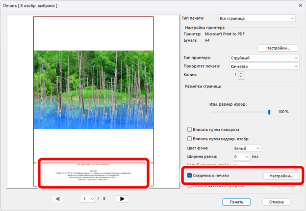 Чтобы выбрать информацию, печатаемую под каждым снимком, выберите [Сведения о печати] в диалоговом окне «Печать» и щелкните [Настройки].