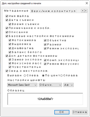 - [Настройки шрифта]: выберите шрифт, стиль и кегль, используемые для печати метаданных.