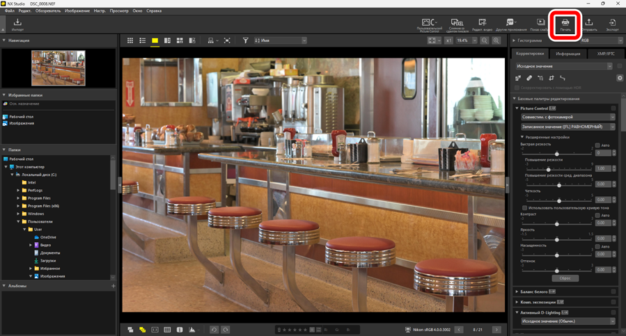 Чтобы распечатать изображения на принтере, подключенном к компьютеру, выберите снимки и щелкните [Печать] на панели инструментов.