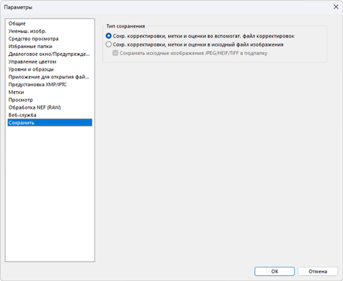Выберите способ сохранения снимков. Корректировки изображения, сделанные в NX Studio, можно сохранить в сопроводительных файлах или применить непосредственно к снимкам.