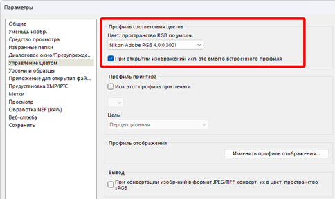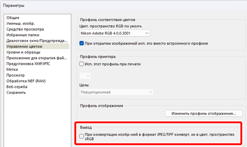 - выберите [При конвертации изобр-ний в формат JPEG/TIFF конверт. их в цвет. пространство sRGB] для [Управление цветом] > [Вывод] в диалоговом окне параметров (0 Диалоговое окно «Параметры», [Управление цветом]), а затем
