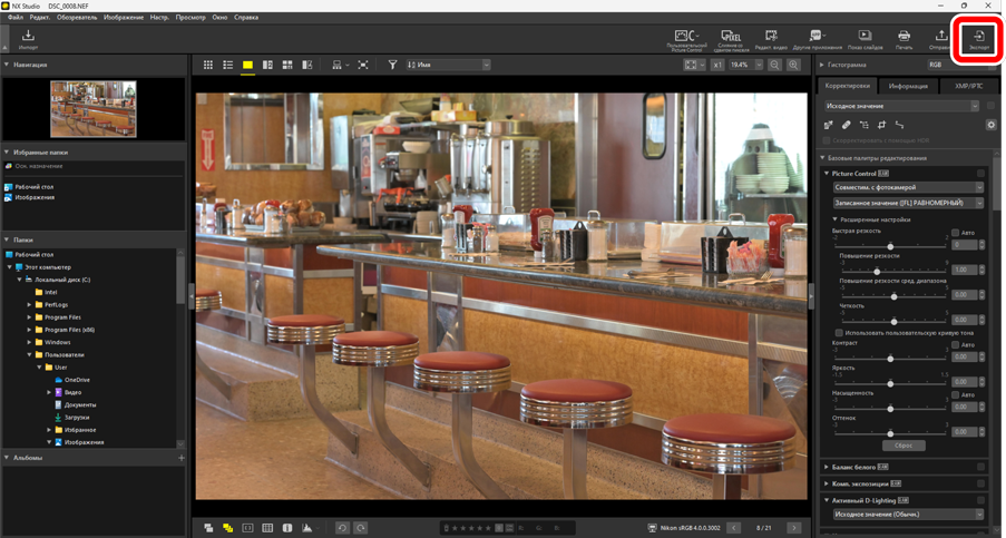 Чтобы экспортировать выбранные снимки в формате JPEG, HEIF или TIFF, нажмите [Экспорт] на панели инструментов. Экспорт снимков RAW (NEF/NRW) и снимков NEFX (результат слияния снимков, сделанных со сдвигом пикселя) в виде файлов JPEG, HEIF или TIFF позволяет использовать их в других программах. При желании для экспорта можно выбрать целые папки.