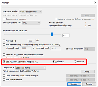 - Если ни один параметр не выбран, исходный цветовой профиль будет встроен в снимки во время экспорта.