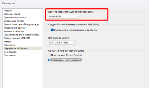 Выберите нужный вариант для [Обработка NEF (RAW)] > [Цвет. пространство для воспроизв. цвета] в диалоговом окне параметров (0 Диалоговое окно «Параметры», [Обработка NEF (RAW)]).