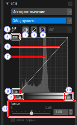 - Щелкните эту кнопку, а затем щелкните снимок, чтобы добавить точку к кривой общей светлости, соответствующую значению пикселя под курсором.