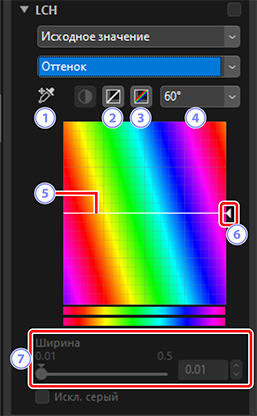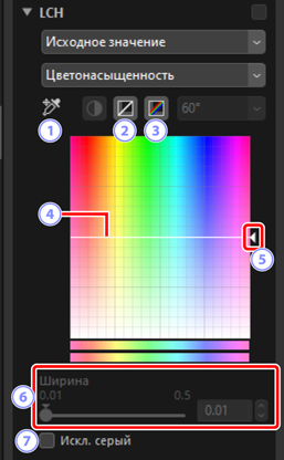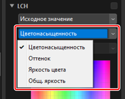 Внесите корректировки в каналы освещенности, цветонасыщенности и оттенка. Выберите канал, используя меню в инструменте LCH. Доступные параметры зависят от выбранного канала. Инструмент LCH не отображается, когда включена функция [Скорректировать с помощью HDR].