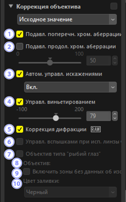 - Корректируйте вариации периферийного освещения, которые возникают при использовании некоторых объективов. Чем выше значение, тем ярче результат.