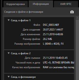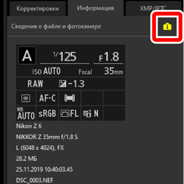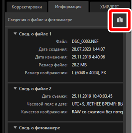 - Показывает сведения об изображении и настройки для выбранных снимков.