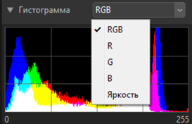 - Выберите [RGB] для отображения гистограмм для всех трех каналов, [R] (красный), [G] (зеленый) и [B] (синий), наложенных друг на друга. Области, в которых гистограммы перекрываются, показаны другим цветом. Перекрывание [G] и [B] показано голубым цветом, перекрывание [R] и [B] показано пурпурным цветом, а перекрывание [R] и [G] – желтым. Области, в которых перекрываются все каналы, показаны белым цветом.