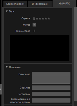 Редактируйте метаданные XMP/IPTC, включая метки и оценки. Изменения меток и оценок в области просмотра или меню [Изображение] отражаются во вкладке [XMP/IPTC].