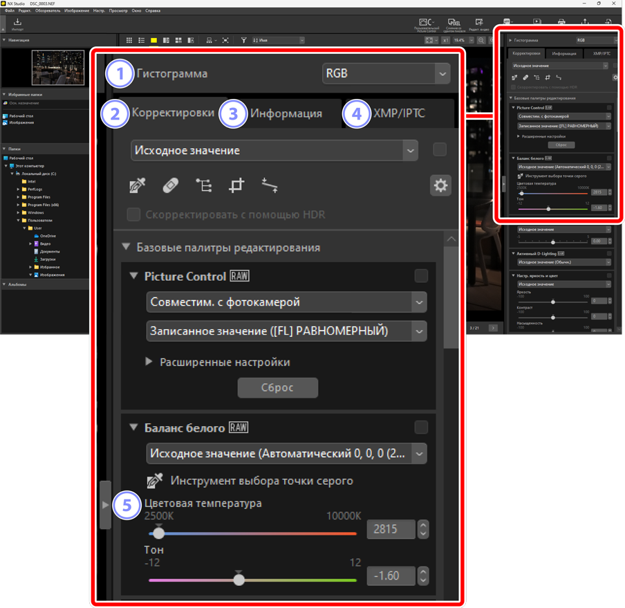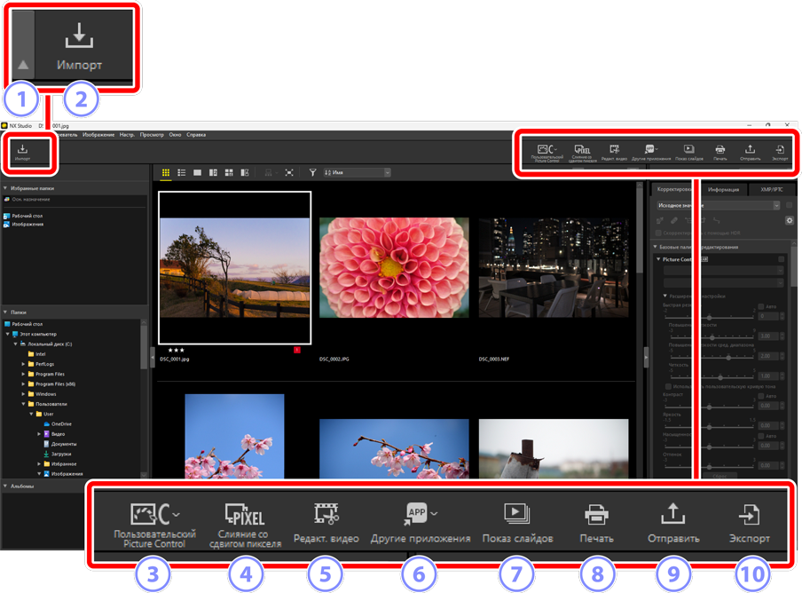 - [Открыть исходный файл изображения без изменений (корректировки не применяются).]: Файлы будут открыты в оригинальных форматах. Улучшения, сделанные в NX Studio, не будут применены.