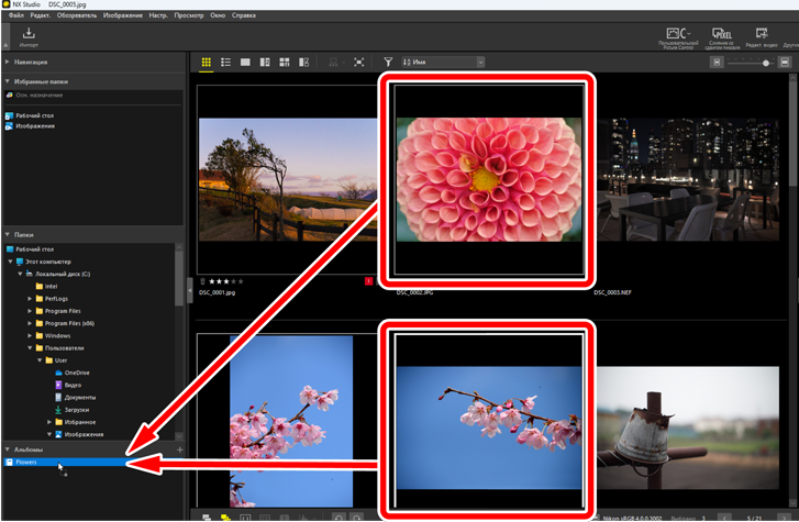 - Иерархическое отображение папок в компьютере. Щелкните папки, чтобы отобразить содержащиеся в них снимки в области просмотра.