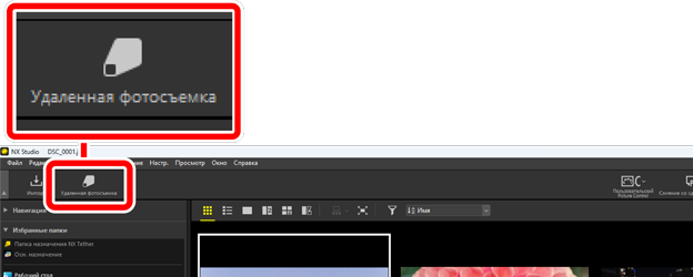 Если установлена программа NX Tether, ее можно запустить, щелкнув [Удаленная фотосъемка] на панели инструментов.