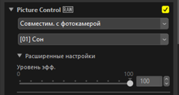 - [Посл. режим Picture Control]: цвета обрабатываются с использованием новейших режимов Picture Control, в том числе обозначенных как [Creative Picture Control]. Режимы Picture Control и параметры, добавленные с новейших фотокамер, можно применять к изображениям в формате RAW, сделанным на модели, не поддерживающие эти параметры.