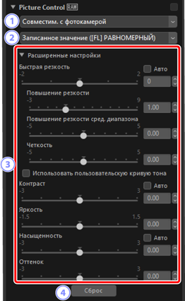 При выборе снимков, сделанных фотокамерой, использующей последние режимы Picture Control (параметр процесса воспроизведения цвета установлен на [Совместим. с фотокамерой]), или снимков, для которых установлен процесс воспроизведения цвета [Посл. режим Picture Control], отображаются следующие параметры. Если вы выбрали [Гибкий цвет] в качестве варианта Picture Control, см. «Инструмент Picture Control (Гибкий цвет)» (0 Инструмент Picture Control (Гибкий цвет)).