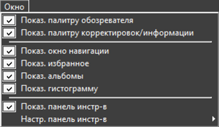 - [Показ. палитру обозревателя]/[Показ. палитру корректировок/информации]/[Показ. окно навигации]/[Показ. избранное]/[Показ. альбомы]/[Показ. гистограмму]