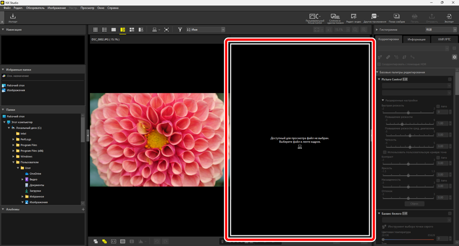 - Снимки, экспортированные в формате JPEG, HEIF или TIFF с помощью NX Studio, восстанавливаются до настроек, действовавших на момент экспорта снимка.